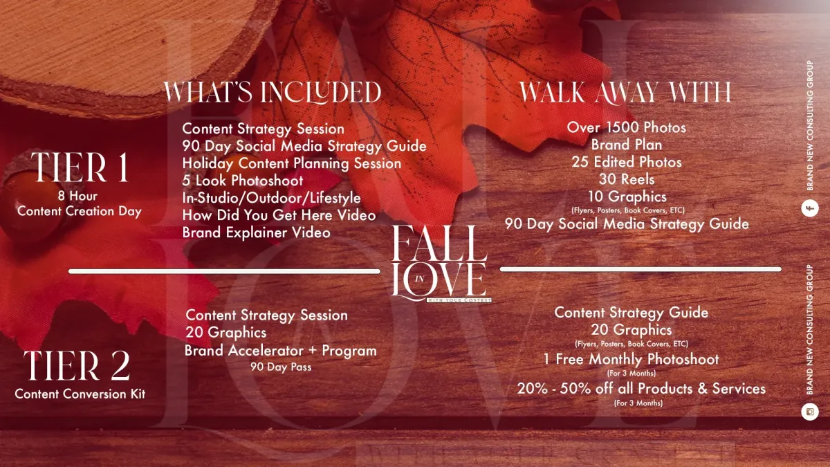 The Fall in Love With Your Brand Content Kit is a premium, done-for-you experience designed to give entrepreneurs everything they need to show up boldly and consistently. It combines strategy, storytelling, and stunning visuals to help you reconnect with your vision, attract your dream clients, and confidently share your brand with the world. From a 90-day social media plan to cinematic video assets and a 5-look photoshoot, this kit equips you with the clarity, confidence, and content library to market your business with ease and authority.